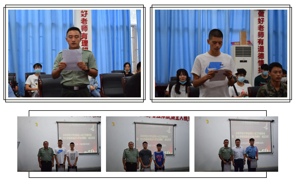 会议开始,首先由退役大学生李茂鑫、彭南峰汇报在其部队的成长经历。他们谈到在部队时,如何在生活、纪律、学习等方面严格要求自己,一步一步成长。同时,他们也对即将入伍的学生寄予祝福,希望他们在部队中得到成长,尽显男儿本色。接下来,2020年新入伍学生代表曾斌汇报参军感言,他谈到自己对入伍的向往,对入伍生活的期盼,希望能够在部队中多锻炼自己,提升自己。他发言完毕后,单红峰和朱继老师为入伍及退役学生送上了纪念品。