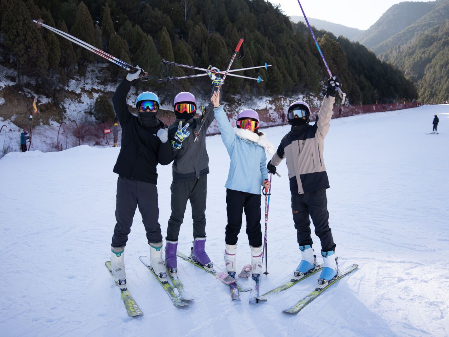 期间,还开展了初级滑雪教学。从装备穿戴、基本滑雪站姿、行走,到正确摔倒与站立,再到犁式滑降、制动、转弯,同学们抓住短暂时间,从雪场开门到清场,中间仅有午餐时间休息了半小时后,主动继续练习。到结束时,所有同学都能在初级雪道上实现自由滑行。