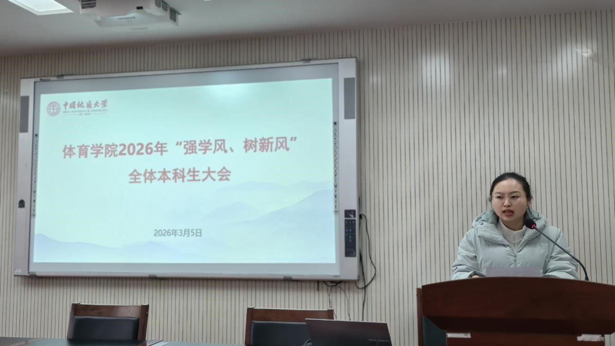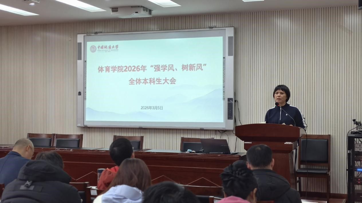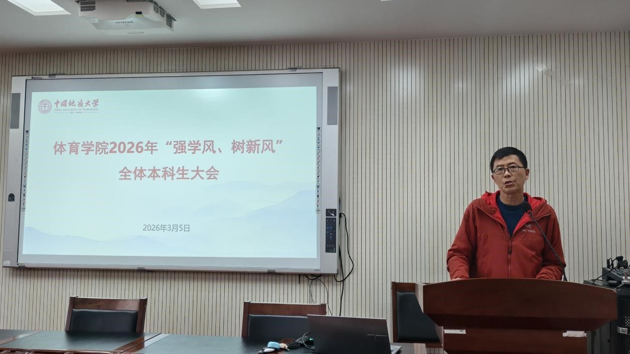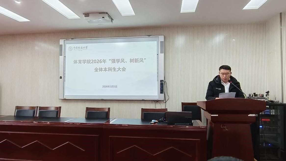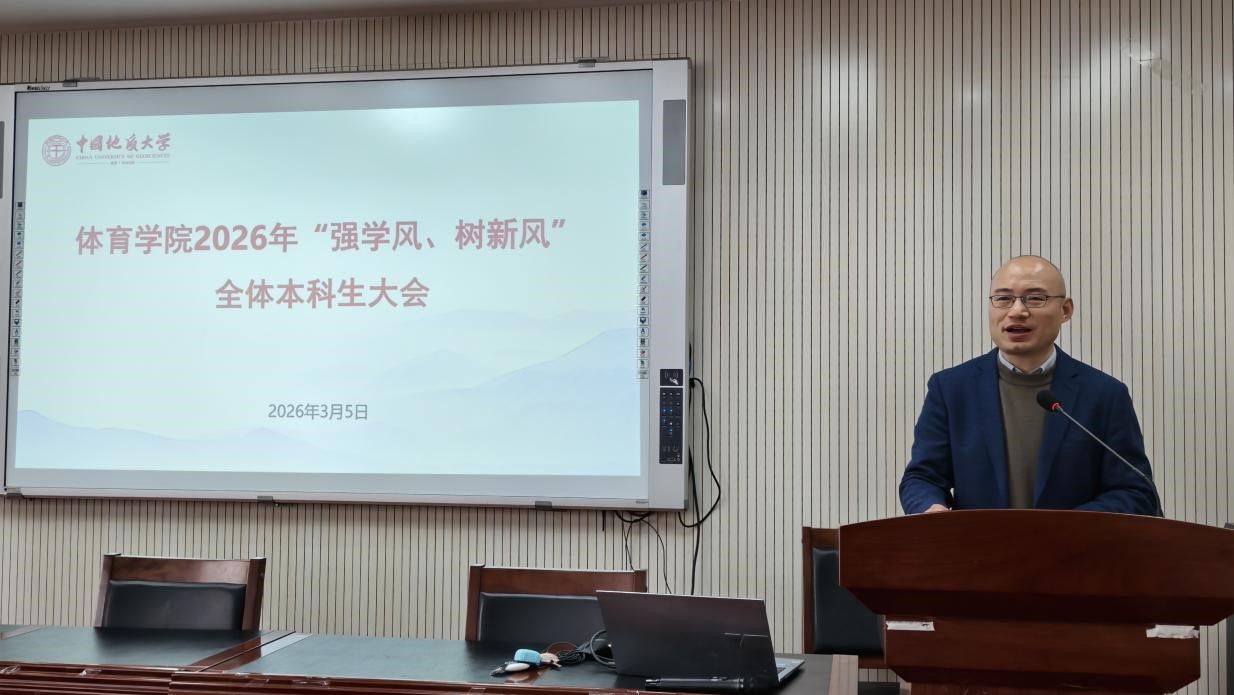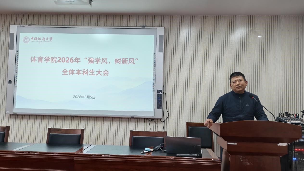 (通讯员 夏奕 杨麦琪 陈爽)为进一步加强学院学风建设,营造“严在地大”的优良育人氛围,引导全体本科生树立优良学习风气,williamhill于2026年3月5日下午在体育馆三楼科报厅召开“强学风,树新风”全体本科生大会,学院全体领导班子、体育系主任、专业课教师、辅导员、班主任、教学秘书及全体本科生参加会议,会议由学院党委副书记朱军主持。