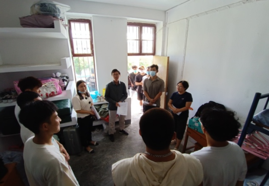 在走访宿舍过程中,学院领导老师对2022级新生的到来表示热烈欢迎。走访本科新生宿舍时,学院领导老师为同学们耐心地介绍学院与专业情况,表示对同学们生活学习方面的关心。学院党委书记庞岚老师详细了解同学们到校后各方面的情况,并向同学们提出几点要求:一是顺利完成从高中到大学角色的转变,既要学习理论知识,也要抓好专项技能,全面锻炼自身素质;二要注意身体健康,严格执行学校防疫各方面制度。三是要及时报平安,经常与父母联系,以免家长牵挂。四是要防范校园贷和网络电信诈骗等,保护自身财产安全。副院长刘良辉老师嘱咐:在学校生活中,同学们要互相团结,相互关心,遇到问题及时向老师和学院汇报。副院长李伦为同学们介绍了体院的特色专业,鼓励同学们不能放松,继续保持学习状态,力争在四年的学习中取得优异成绩。