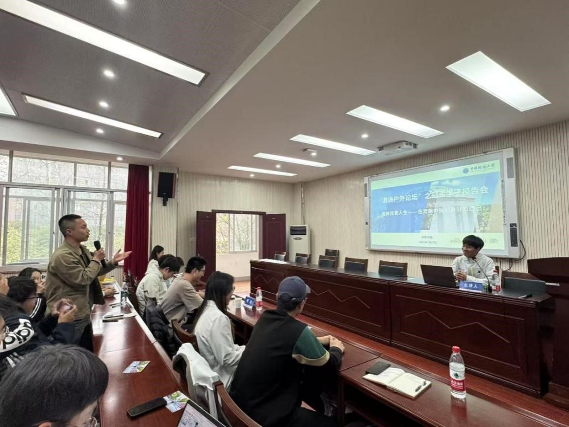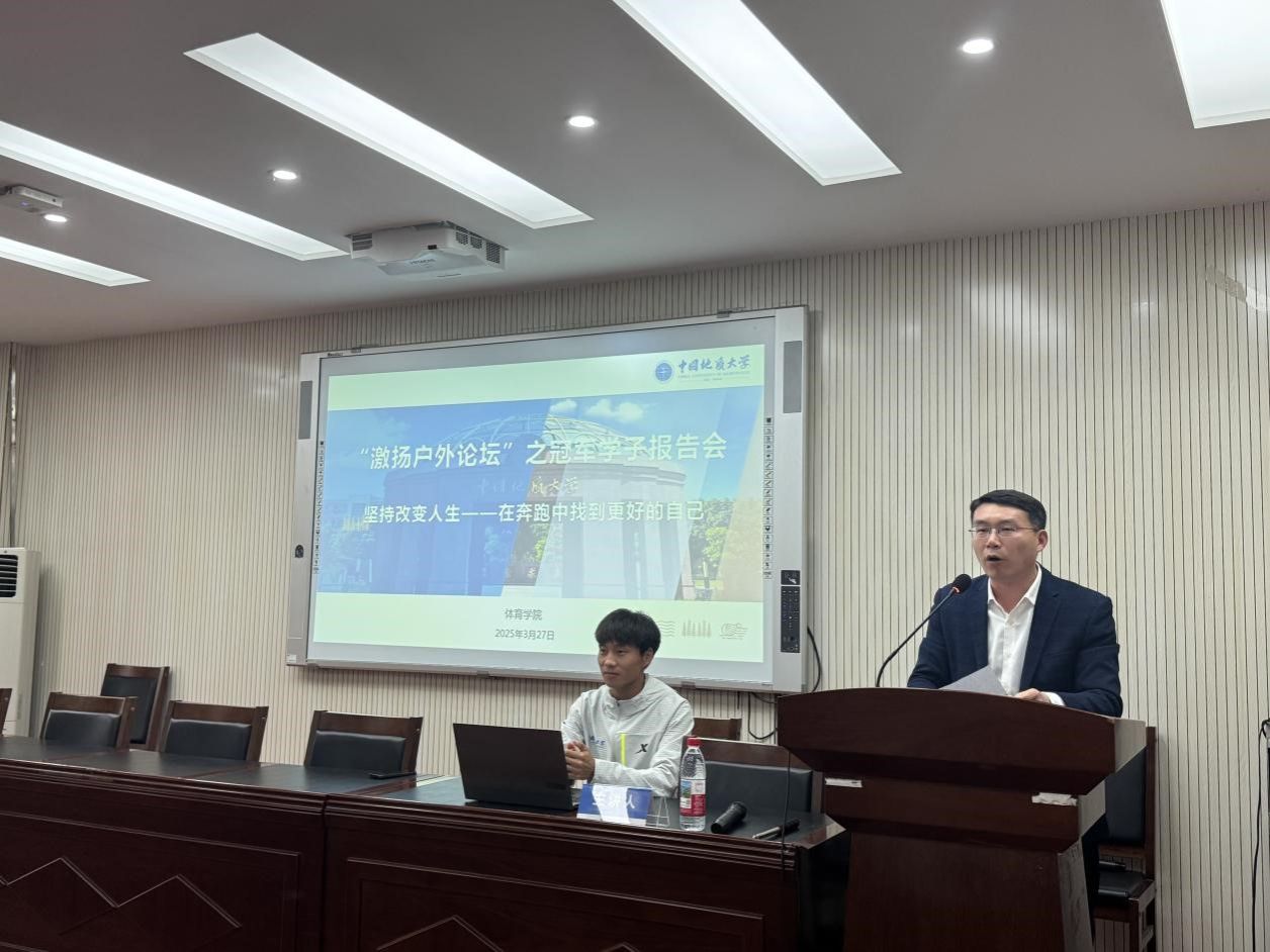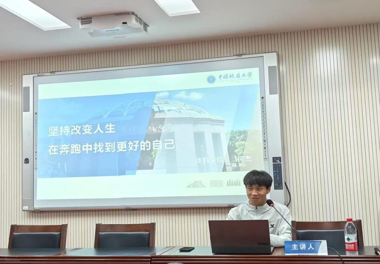 朱军总结讲话。他表示何杰在本次交流中,不仅分享跑步经验与人生感悟,更传递了坚持与热爱的精神。奔跑者的坚持精神,如同火炬般照亮前行之路。青年学生应向何杰同学学习,发扬地大“艰苦朴素,求真务实”的校训精神和攀登精神,不畏艰难,勇于挑战,追求卓越,勇攀人生和事业的高峰,为中国式现代化建设贡献青春力量。